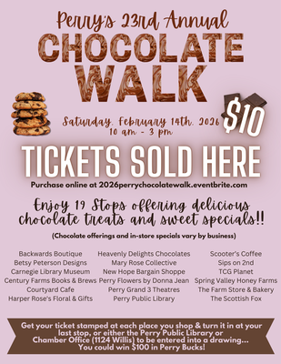 Grab a friend and join us for this Valentine's Day-themed shopping event in Perry - always the second Saturday in February - with 18 shops offering delicious chocolate treats and sweet specials! You'll love this 'sweet' event in Perry, best enjoyed with friends and family!