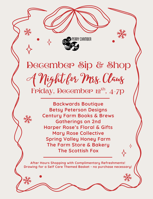 You LOVE Sip & Shops.....so make plans to join us for "A Night for Mrs. Claus!" After hours shopping at Perry businesses with complimentary refreshments! Register to win a Merchants Self Care Basket - no purchase necessary!