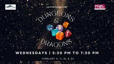 Welcome to a world of Dungeons and Dragons! Dungeons and Dragons is a communal storytelling adventure where you get to play a character of your own creation and make decisions (and rolls) to decide the path of our story and the destiny of your character. Great for newcomers and experienced players alike, our adventures in Candlekeep are based around short one-shot-like adventures that make popping in or coming every time a fun adventure! Players ages 10 and up are invited to join us on Wednesdays in February from 5:30 pm to 7:30 pm. This is a free program, and no registration is required. For more information, go to www.perry.lib.ia.us, visit the library, or call 515-465-3569.