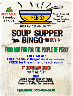 Crossroads Church Free Meal and Bingo Crossroads Church Free Soup Supper and Bingo Meal Served 5:00-7:00pm BINGO begins at 6:30pm Images Gallery Image × Crossroads Church Free Meal and Bingo Set a Reminder Enter your email address below to receive a reminder message. Email address Select the amount of Days before the event -- Select Days Before Event -- 1 Day 2 Days 3 Days 1 Week Captcha Validation Please complete the Captcha Submit Date and Time Saturday Feb 21, 2026 5:00 PM - 8:00 PM CST Location Crossroads Church 2810 1st Ave Perry Contact Information 515-465-5478 Set a Reminder Enter your email address below to receive a reminder message. Email address Select the amount of Days before the event -- Select Days Before Event -- 1 Day 2 Days 3 Days 1 Week Captcha Validation Please complete the Captcha Submit Share × Print Email Add to Calendar Facebook Twitter LinkedIn Tell a Friend × Select Calendar Type × Google Yahoo iCal (Outlook, Apple, or other)