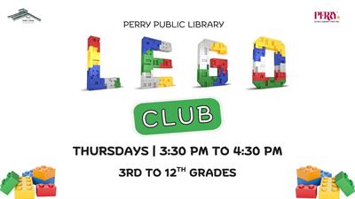 Join the Perry Public Library Lego Club for lego fun on Thursdays in July! Our Library Lego Club features lego challenges and creative activities for patrons in 3rd to 12th grades. We will meet each Thursday in the Community Room from 3:30 pm to 4:30 pm. This is a free program. No registration is required. For more information, go to www.perry.lib.ia.us, visit the library, or call 515-465-3569.