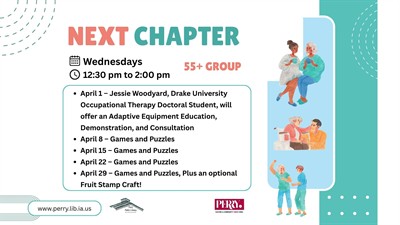 Join us for our weekly “Next Chapter” group for patrons 55+, every Wednesday, from 12:30 pm to 2:00 pm in the Perry Public Library Community Room. We will offer a variety of activities each month, including engaging presentations, social gatherings, games, puzzles, and conversation. You’re invited to bring your lunch to enjoy during our meeting, too! Our April schedule includes: