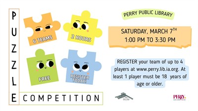 Are you ready for a challenge? Do you think your team can be the first to finish our 500-piece puzzle before time runs out? We are accepting six teams of up to four players for our March Puzzle Competition. Each team must have at least one player who is 18 years of age or older. Gather your teammates and register today at www.perry.lib.ia.us on our March Events page because slots will fill up quickly! Our competition will go from 1:00 pm to 3:30 pm on Saturday, March 7th. Teams will have up to 2 hours to complete the puzzle, and the first team to complete the puzzle or the team that connects the most pieces in 2 hours wins an awesome prize! This is a free event, but space is limited and registration is required. Visit www.perry.lib.ia.us or call 515-465-3569 to register your team today!