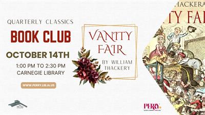 Explore literary classics from a variety of authors with our Quarterly Classics Book Club. For October, the club will discuss William Thackeray’s classic, Vanity Fair, a satirical and witty commentary on English society in the early 19th century. The Quarterly Classics Book Club will meet on Monday, October 13th, from 1:00 pm to 2:30 pm at the Carnegie Library Museum. Books may be purchased in advance for a small fee from the library or borrowed with your Perry Public Library card. For more information, go to www.perry.lib.ia.us, visit the library, or call 515-465-3569