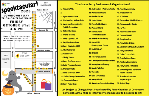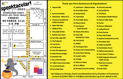 The Perry Chamber of Commerce coordinates this fun activity for the community on the last Friday of October... with more than a thousand kiddos enjoy a safe trick-or-treating experience in downtown Perry. Many thanks to dozens of Perry businesses and organizations that set up on the sidewalk in front of their storefronts and others that pop-up for the evening to hand out treats!
