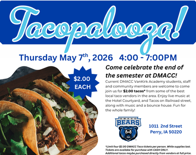 celebrating the end of the school year! Current DMACC VanKirk Career Academy students, staff and community members are welcome to join us for $2.00 tacos from some of the best taco vendors in town!